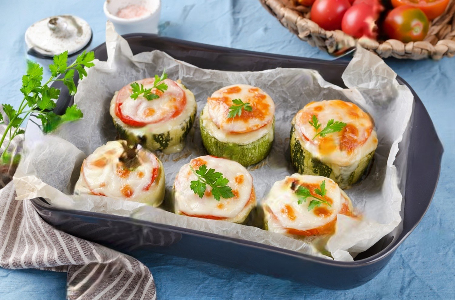 - En refractario colocar las rebanadas de calabacita y cubrir con las rebanadas de jitomate.